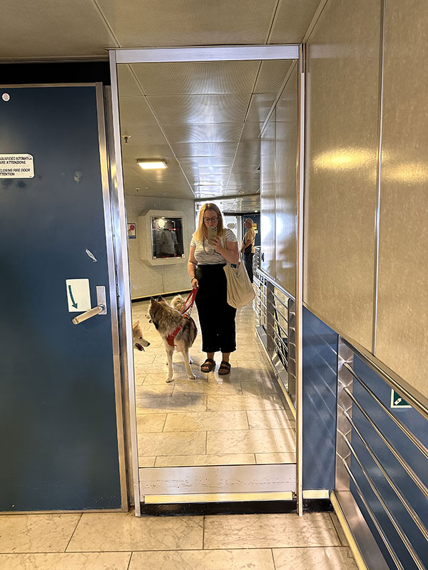Pro: entspanntes Reisen mit Hund zusammen, Hundekabine ist praktisch, Außen-Hundedeck sehr nützlich — wir haben viele andere Hundebesitzer getroffen (sogar einen anderen Husky! ♥), sauber und sicher wirkte es. Für längere Strecken ist eine Kabine deutlich stressmindernd.