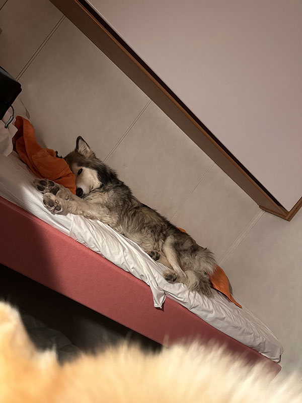 - In der Kabine durften unsere beiden Hunde selbstverständlich mit — die Kabinen haben kein Teppich, sondern eine leicht zu reinigende Linoleum-/PVC-Beschichtung; die Betten waren überraschend bequem und wir sind nachts direkt ins Bett gefallen (waren auch erst um 1 Uhr nachts an Board, mit 4 Stunden Verspätung).